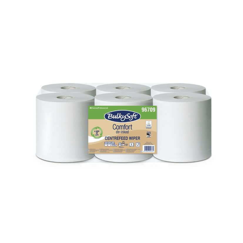 Elevate your hand drying experience with BulkySoft Centrefeed Hand Towels. These white, de-inked 2-ply towels feature micro-embossing, offer exceptional absorbency and a soft feel. Each roll, measuring 177mm high and 170mm in diameter, contains 275 sheets and is 110m long. The removable 61mm core ensures easy dispensing. Supplied in cases of 6 rolls.